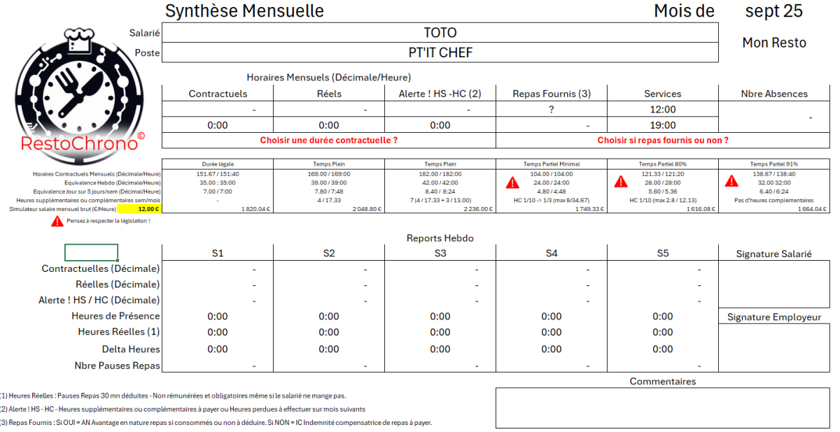 RestoChrono© est une application professionnelle basée sur Microsoft Excel, conçue pour suivre et gérer les heures de travail individuelles du personnel d’un restaurant. Elle allie précision technologique et compréhension des besoins spécifiques du secteur de la restauration.